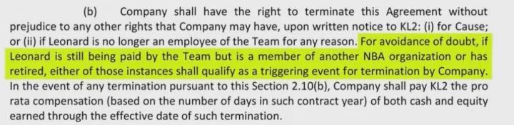 据资料显示,伦纳德与Aspiration公司签下了一笔价值2800万美元的代言合同,然而这实际上是一个根本不存在的挂名职位,并且这家公司获得了鲍尔默5000万美元的资金支持......协议中规定,伦纳德必须一直留在快船才能拿走全部的2800万美元,如果换队或退役合同就会提前终止。