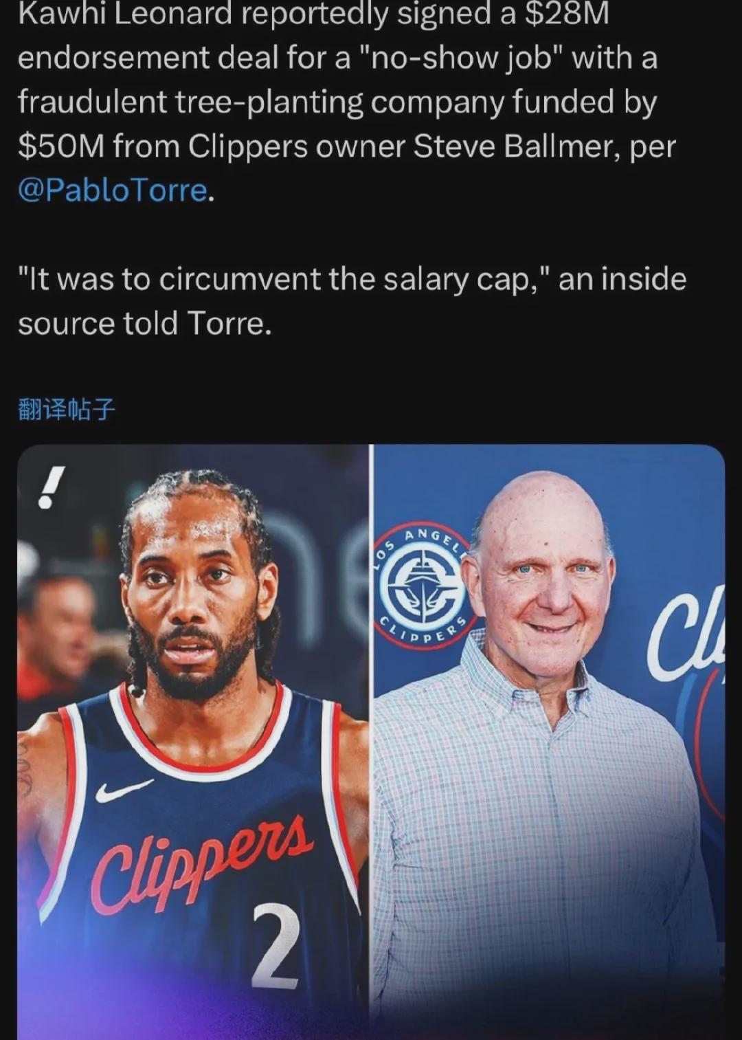 TA记者爆料快船老板鲍尔默和伦纳德签约阴阳合同规避工资帽,后者凭空多拿2800万美元。