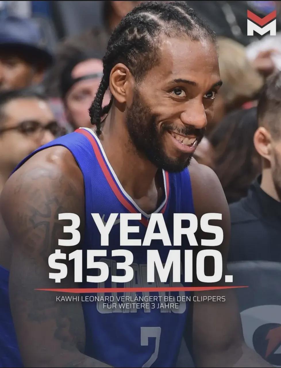 迄今为止,在公开报道里面,伦纳德总共和快船签下三份合同,第一份是19年的3年1.03亿美元,第二份是21年的4年约1.76亿美元,第三份是去年的3年约1.52亿美元。